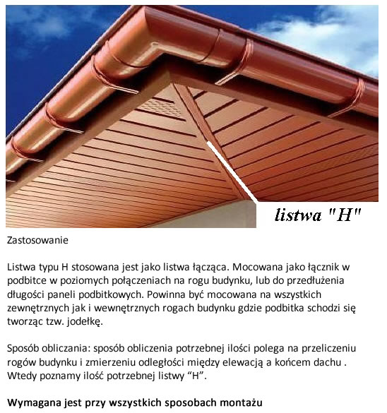 Listwa typu H stosowana jest jako listwa łącząca . Mocowana jako łącznik w podbitce w poziomych połączeniach na rogu budynku lub do przedłużenia długości paneli podbitkowych. Powinna być mocowana na wszystkich zewnętrznych jak i wewnętrznych rogach budynku gdzie podbitka schodzi się tworząc tzw jodełkę (patrz foto galeria produktu ).